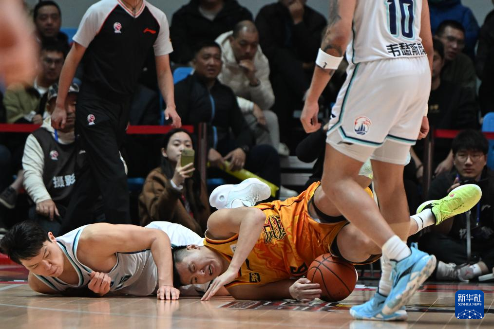 12月9日,江苏肯帝亚队球员马国栋(右下)与青岛国信制药队球员杨瀚森在比赛中倒地拼抢。