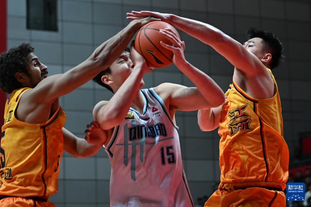 12月9日,江苏肯帝亚队球员杰克逊(左)与陶彦儒(右)封盖青岛国信制药队球员杨瀚森。