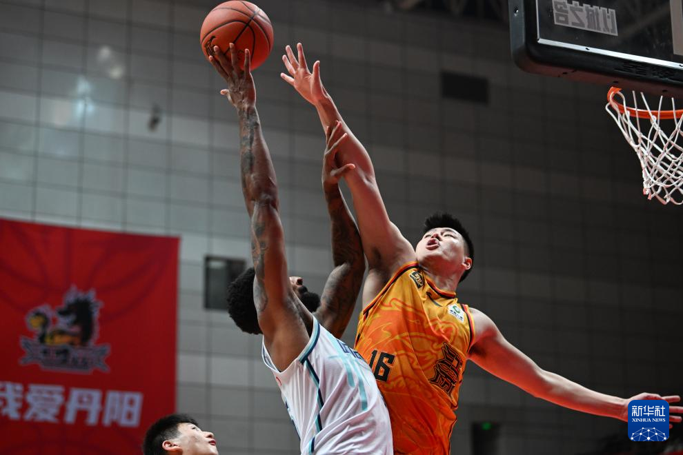 12月9日,青岛国信制药队球员杨瀚森(左)在比赛中上篮。