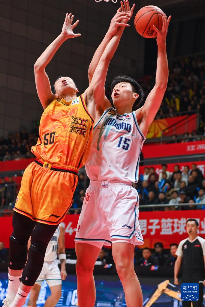 12月9日,青岛国信制药队球员杨瀚森(右)与江苏肯帝亚队球员郑祺龙在比赛中拼抢。