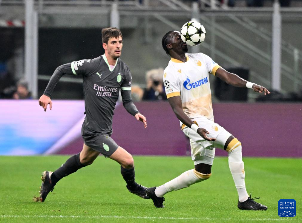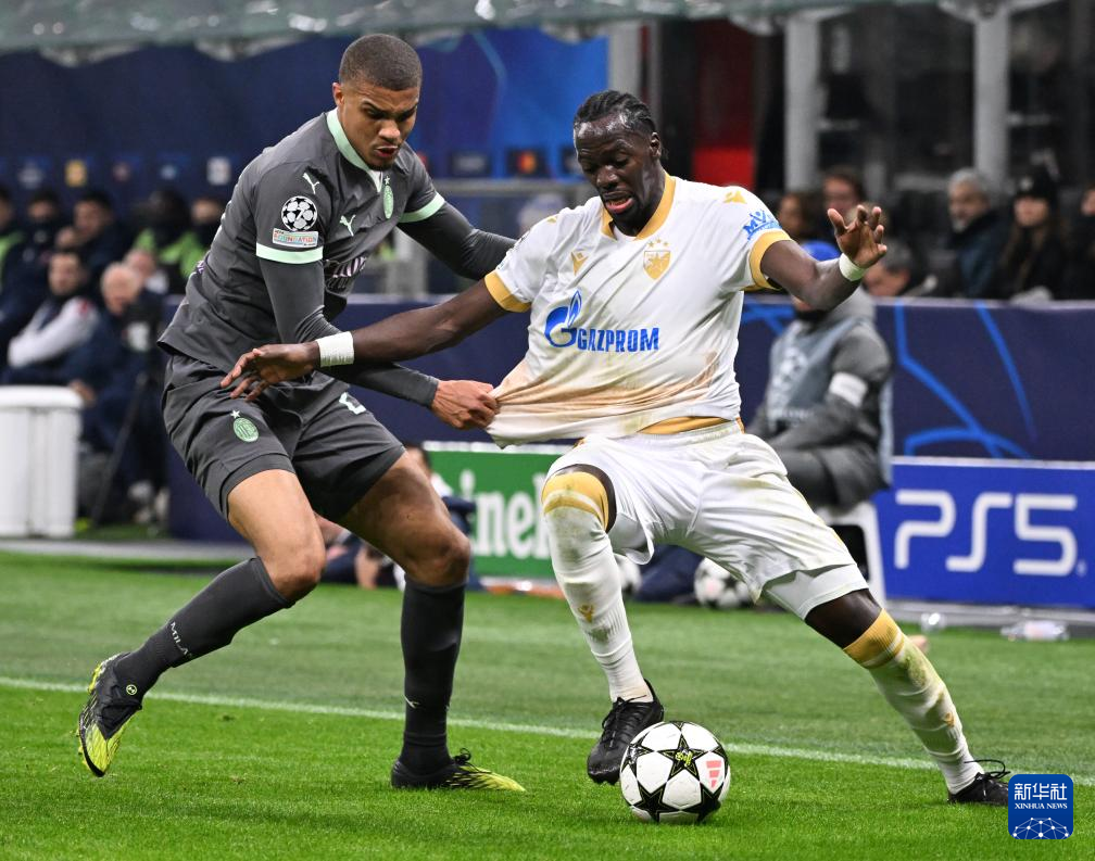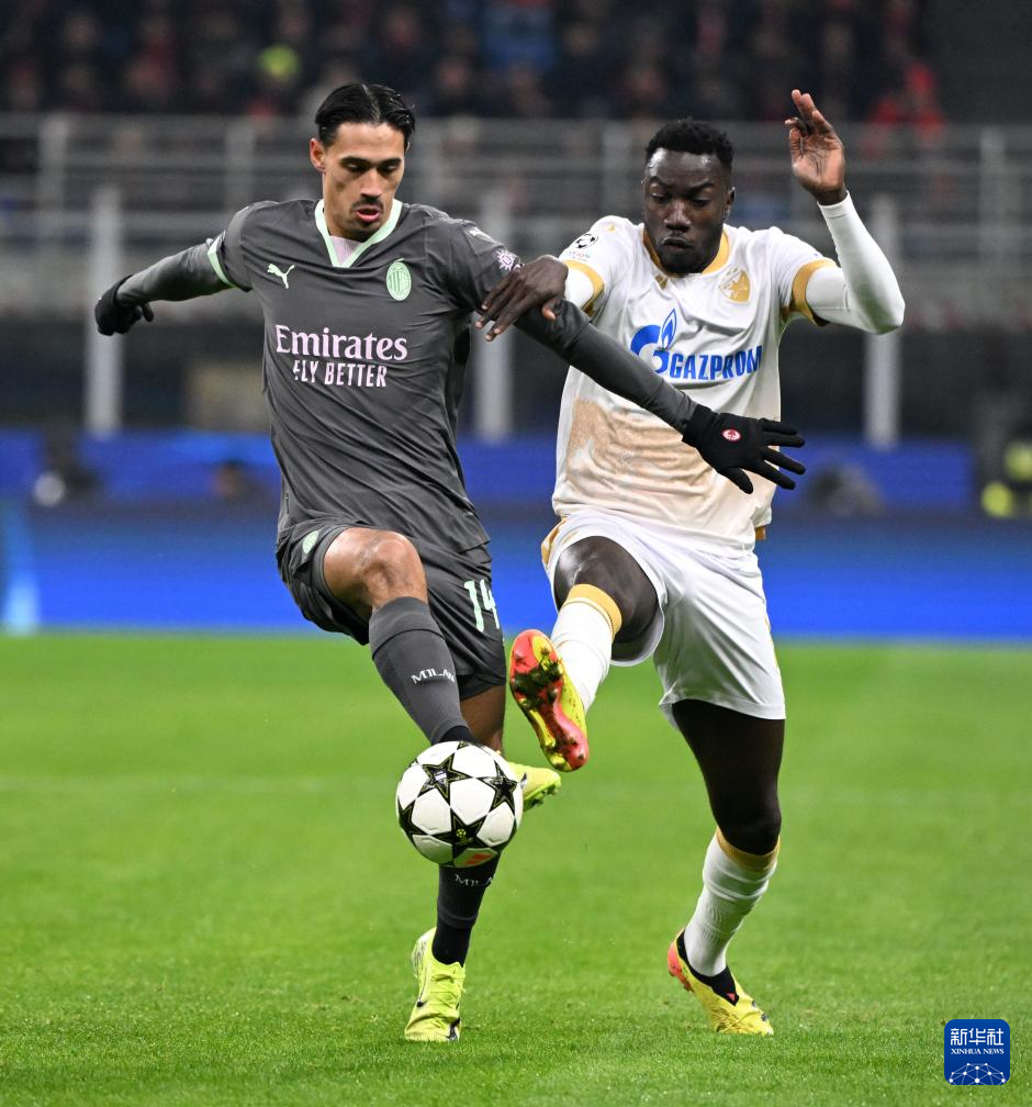 12月11日,AC米兰队球员马利克·佳夫(左)与贝尔格莱德红星队球员恩迪亚耶在比赛中拼抢。
