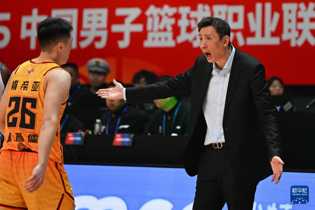 12月11日,江苏肯帝亚队主教练易立(右)在比赛中指导球员。