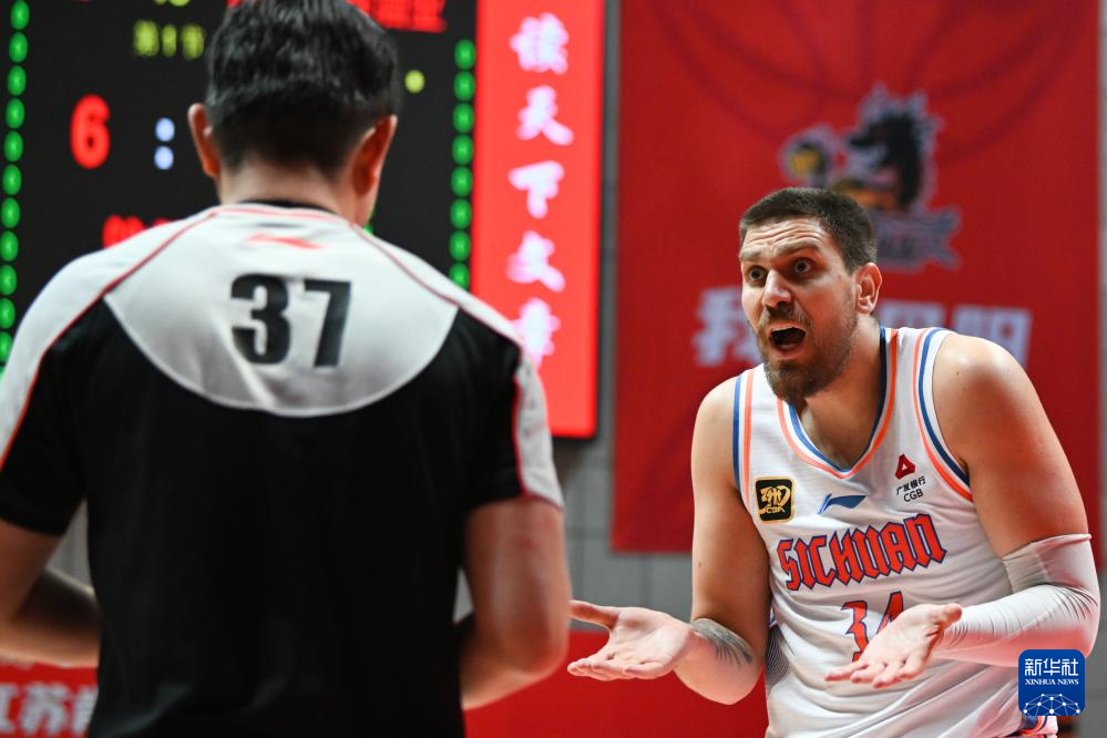 12月11日,四川丰谷酒业队球员马里奇(右)与裁判沟通。