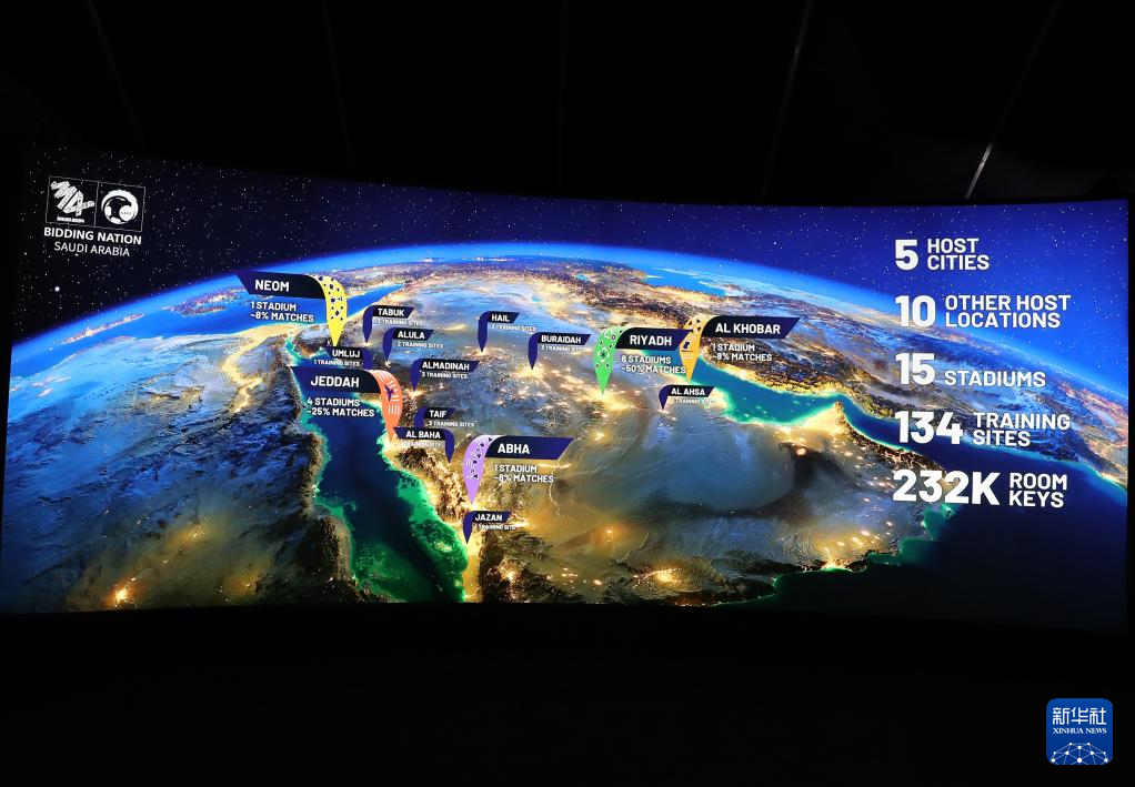 这是在沙特阿拉伯首都利雅得举办的2034年FIFA世界杯申办展览上拍摄的举办城市示意图(12月11日摄)。