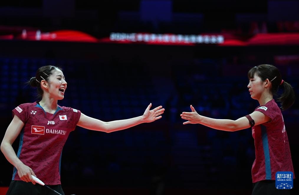 12月12日,松山奈未/志田千阳(左)在比赛中庆祝得分。