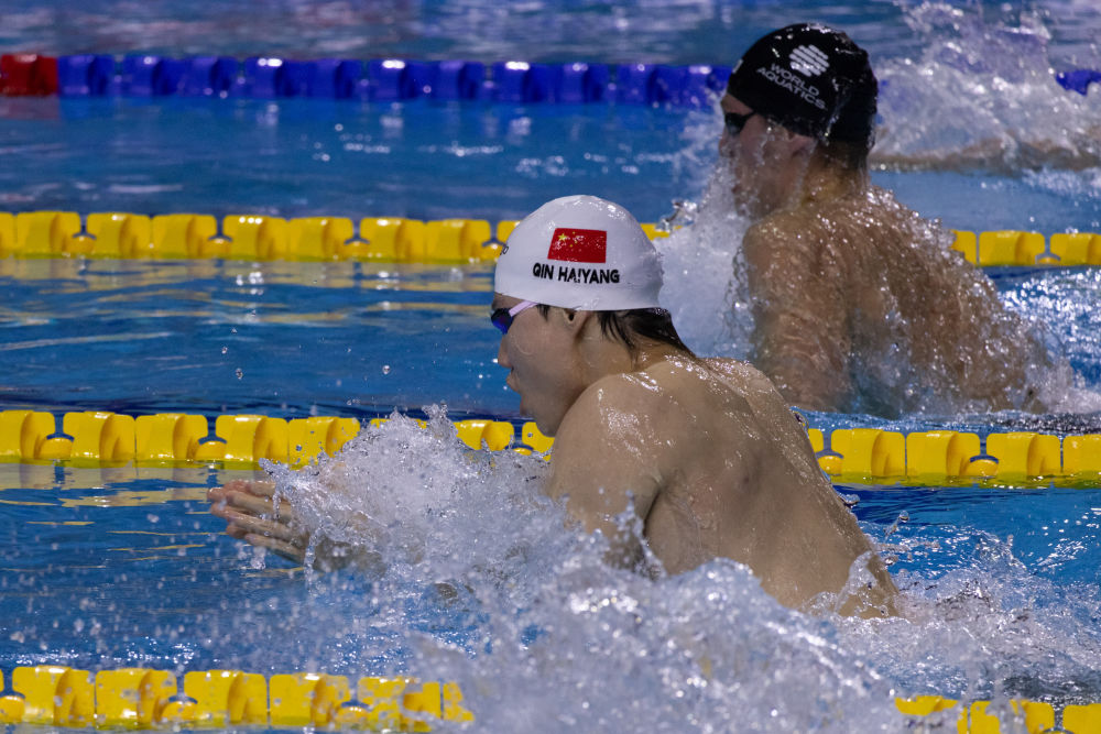 11日刚刚刷新女子100米蛙泳亚洲纪录的唐钱婷,12日在决赛中顺利夺冠,1分02秒38的成绩比世界纪录仅慢0.02秒。在男子100米蛙泳预赛、半决赛中都位居第二名的覃海洋在决赛中迎来爆发,以55秒47打破赛会纪录和亚洲纪录摘金。