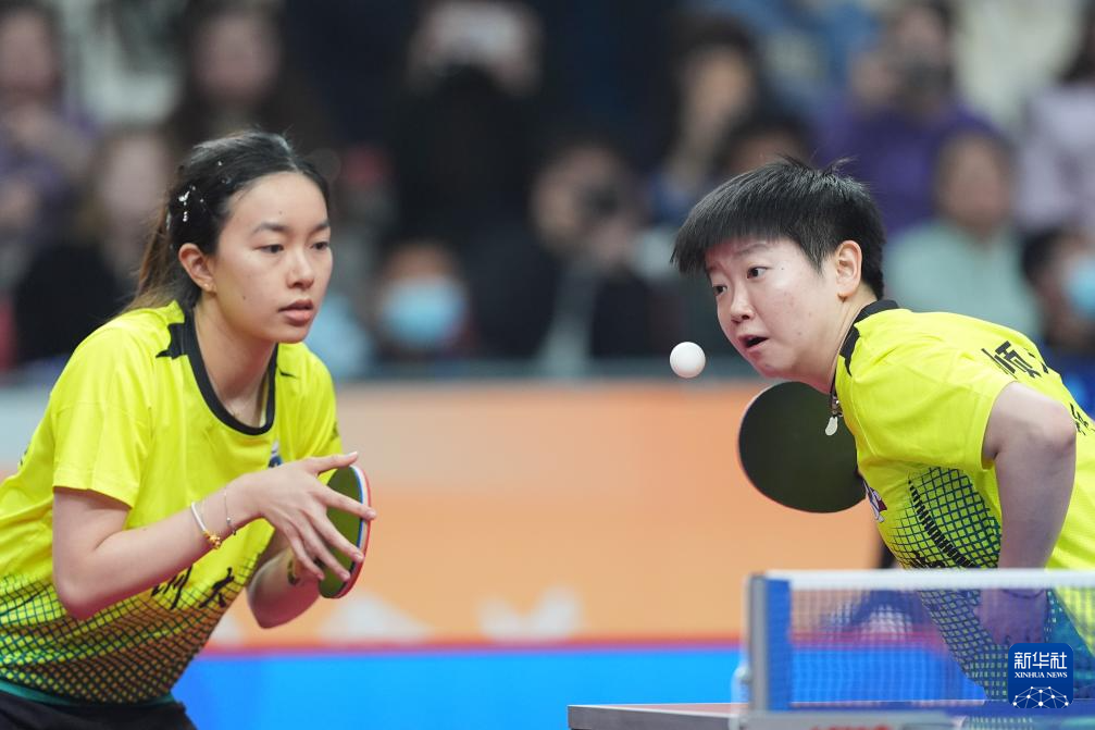 12月12日,深圳大学队组合孙颖莎(右)/吴咏琳在女子团体双打比赛中,她们3比0战胜成都高新若水居队组合杨玉鑫/冷雨桐。最终,深圳大学队3比0战胜成都高新若水居队。