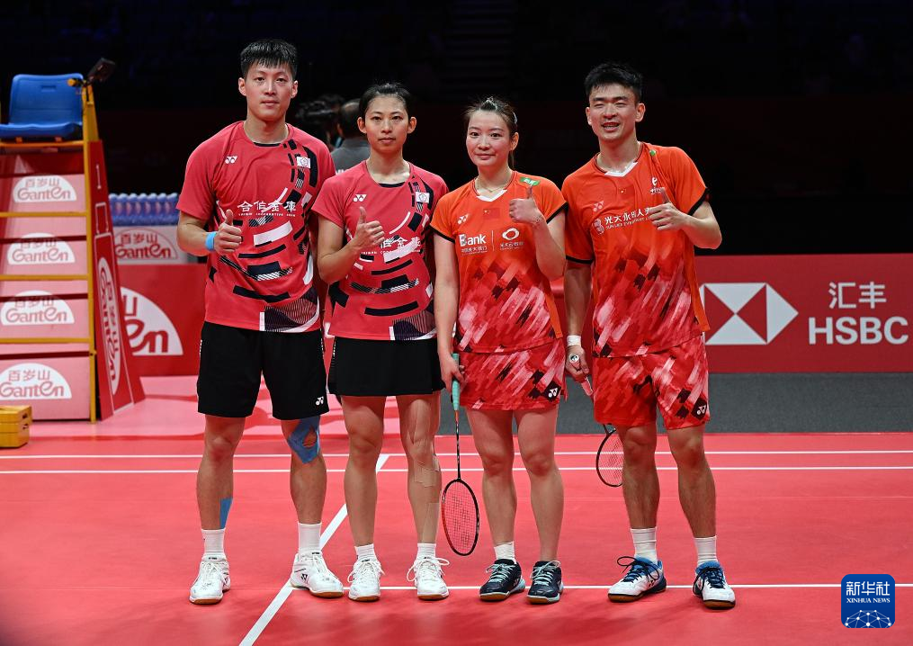 12月13日,郑思维(右一)/黄雅琼(右二)在赛后与杨博轩(左一)/胡绫芳合影。