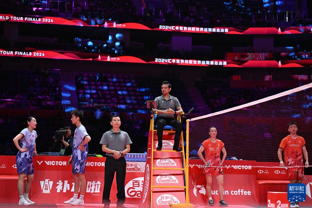 12月14日,郑思维(右一)/黄雅琼(右二)和蒋振邦(左二)/魏雅欣(左一)在比赛间隙。