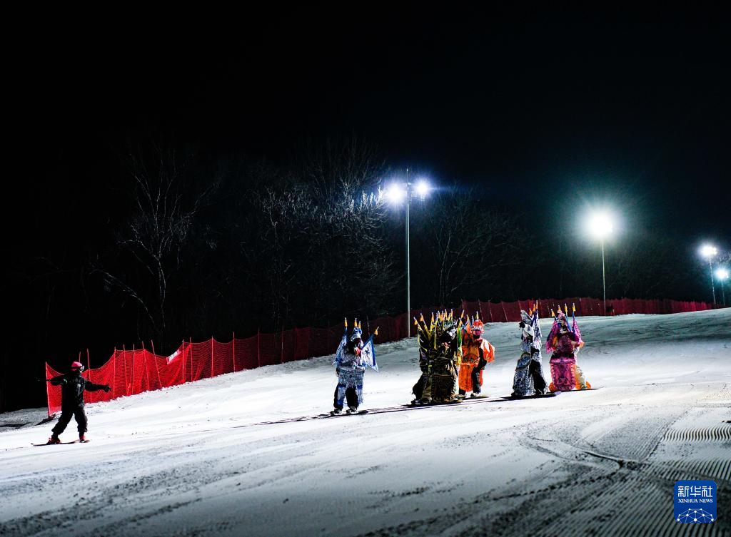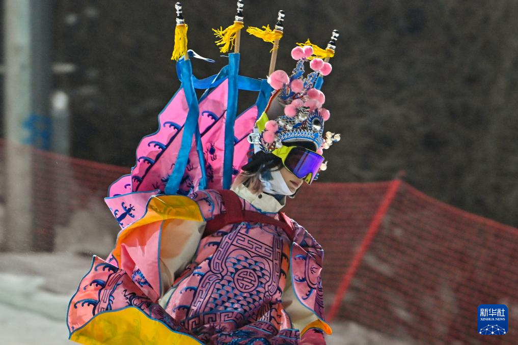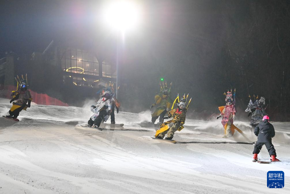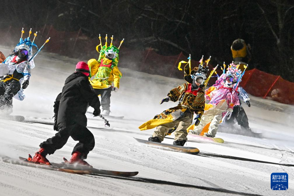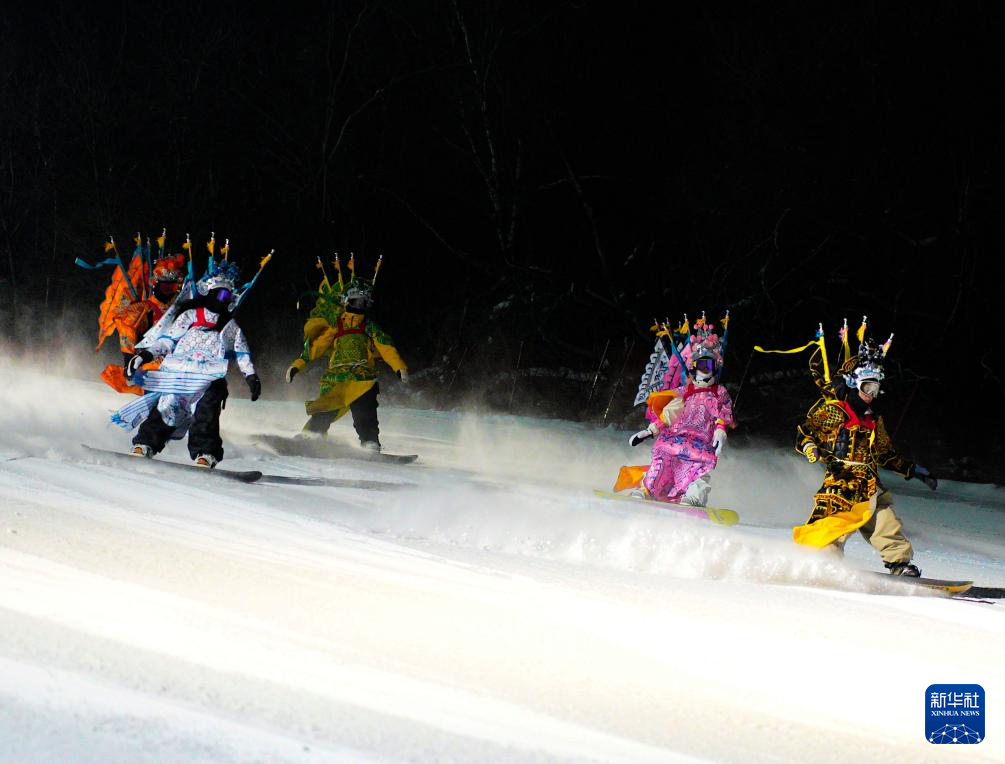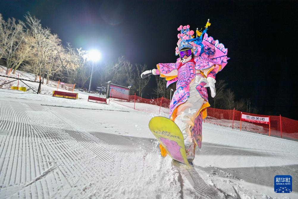 夜幕降临,在吉林省吉林市万科松花湖度假区的雪道上,几位滑雪爱好者陆续走下缆车。他们脚踩单板,身着京剧服饰,经过简单交流后纵身一跃,从雪道上飞驰而下。身后的“靠旗”与扬起的雪花一同在空中飞舞,京剧身段与单板特技的有机融合,展现出滑雪运动别样的“国潮”之美。