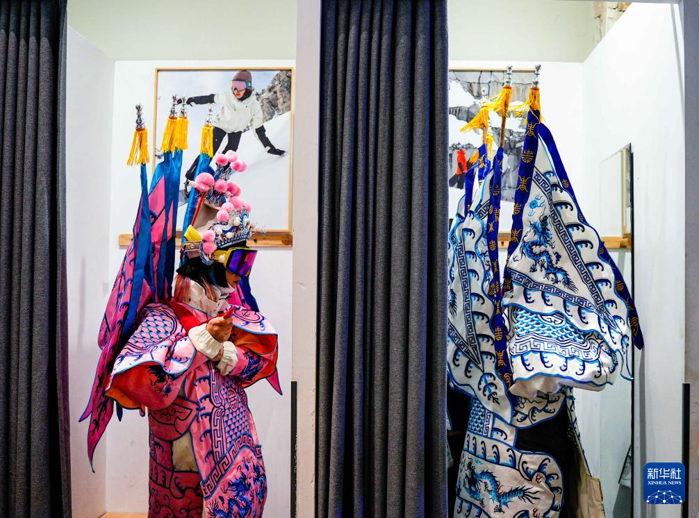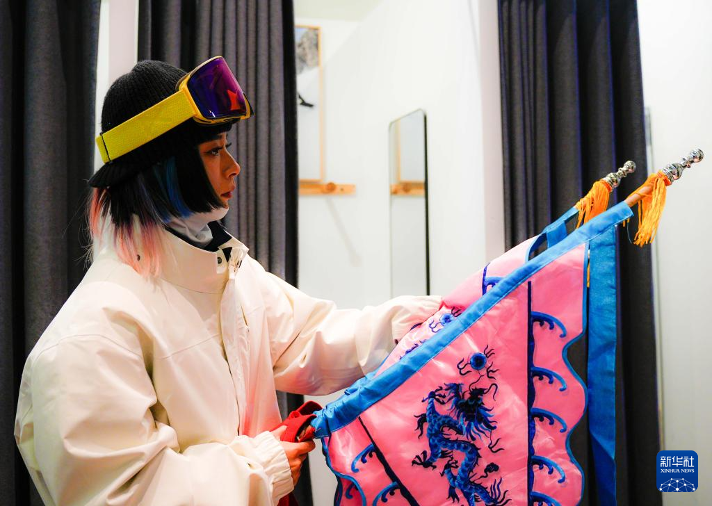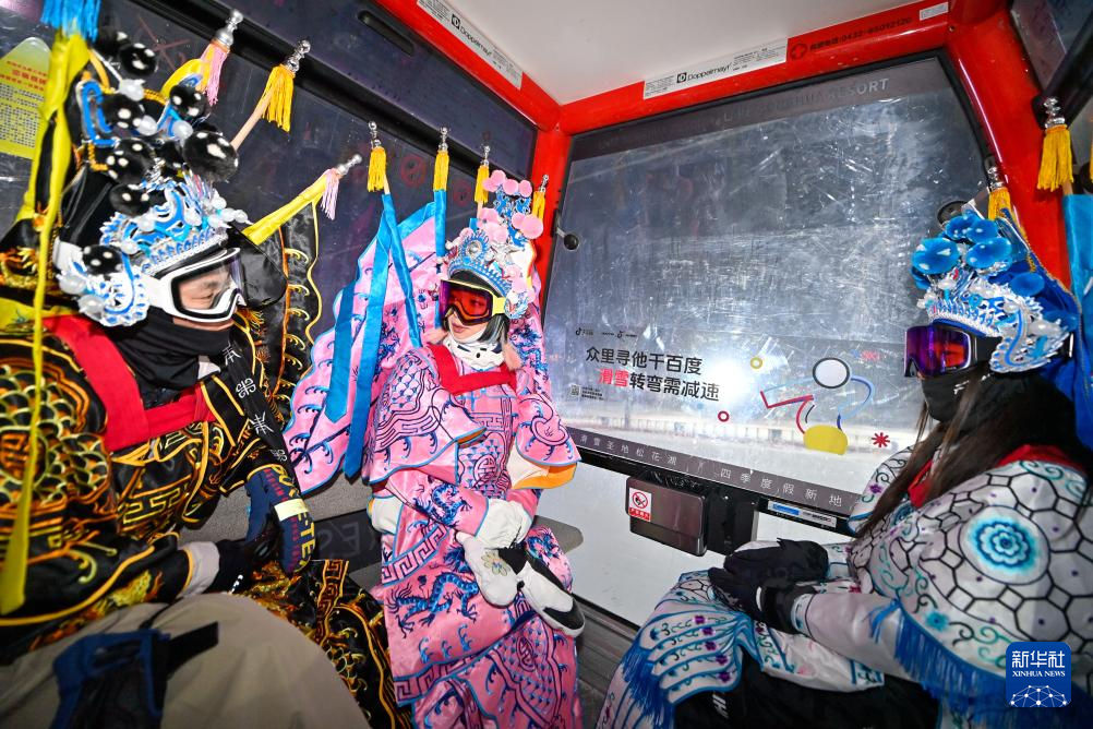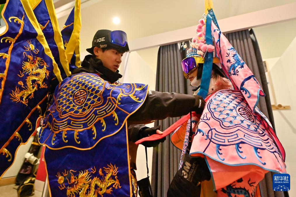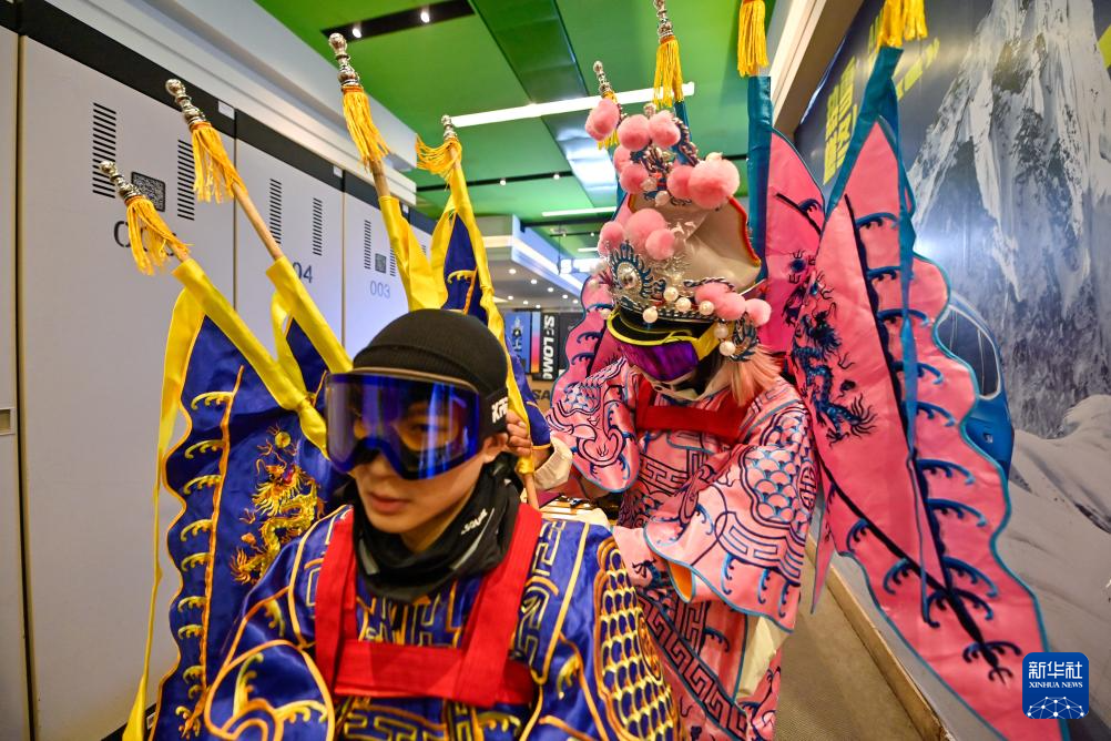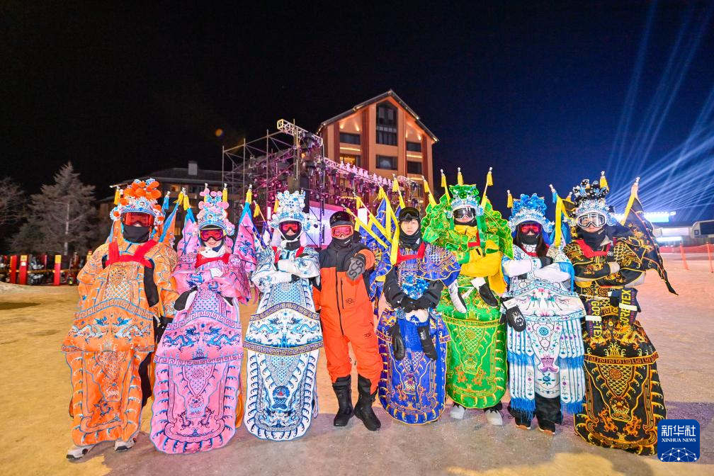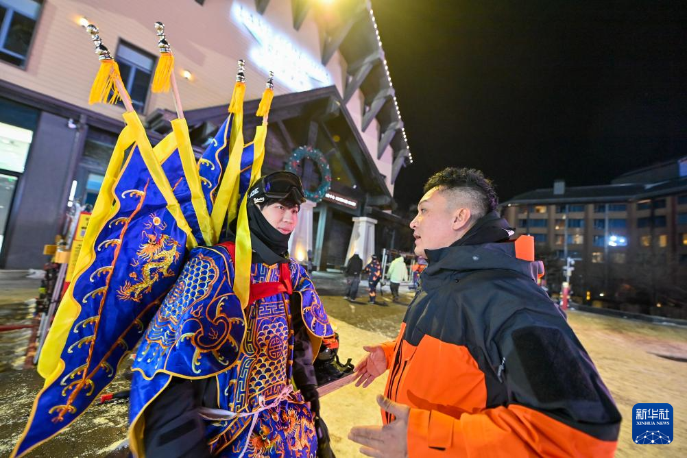 夜幕降临,在吉林省吉林市万科松花湖度假区的雪道上,几位滑雪爱好者陆续走下缆车。他们脚踩单板,身着京剧服饰,经过简单交流后纵身一跃,从雪道上飞驰而下。身后的“靠旗”与扬起的雪花一同在空中飞舞,京剧身段与单板特技的有机融合,展现出滑雪运动别样的“国潮”之美。