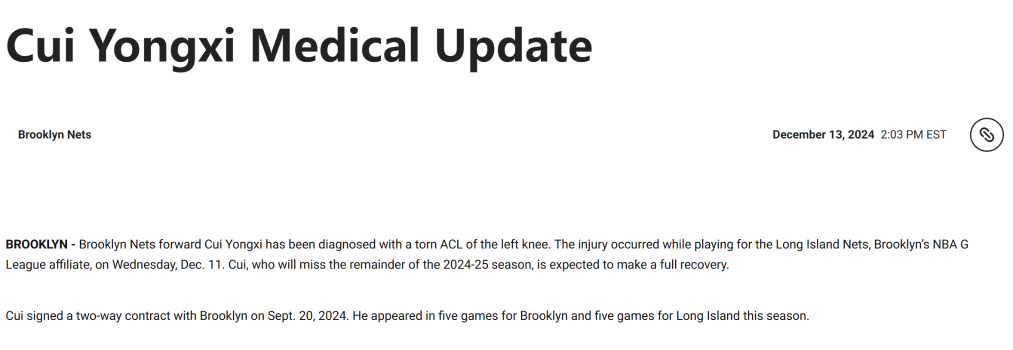 新华社北京12月14日电(记者曹奕博)美职篮(NBA)布鲁克林篮网队14日发布伤病更新,中国球员崔永熙遭遇左膝前交叉韧带撕裂,将缺席本赛季剩余所有比赛。