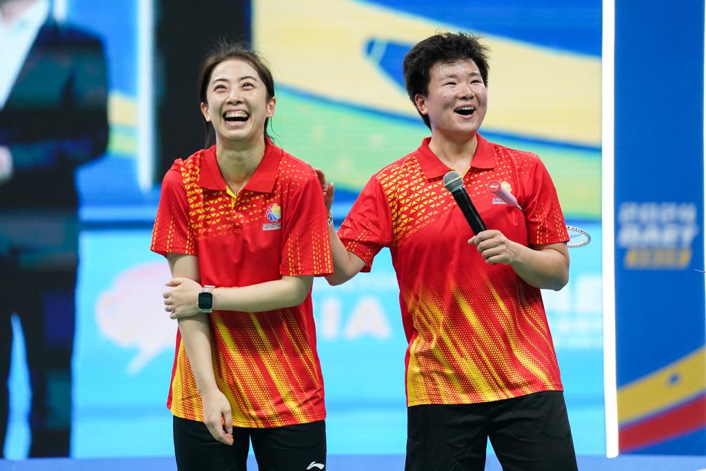 12月15日,王适娴(左)、何冰娇在赛后接受采访。新华社记者 杜宇 摄