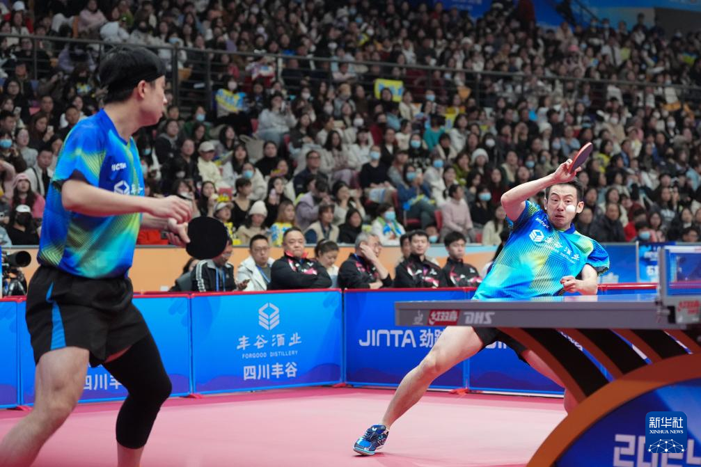 12月16日,山东魏桥·向尚运动队组合周启豪(右)/林昀儒在男子团体双打比赛中,他们3比1战胜四川丰谷队组合夏易正/黄镇廷。最终,山东魏桥·向尚运动队3比0战胜四川丰谷队。