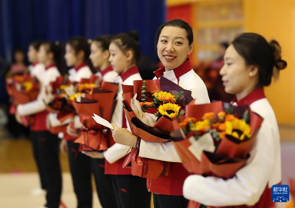 12月20日,中国艺术体操队小队员在登榜仪式上向教练阿纳斯塔西娅·布利兹纽克献花。新华社记者 贾浩成 摄