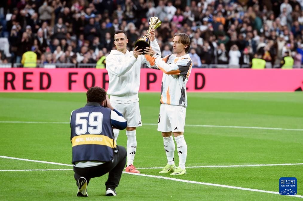12月22日,皇家马德里队球员莫德里奇(右)和卢卡斯·巴斯克斯在比赛前展示球队获得的2024国际足联洲际杯奖杯。