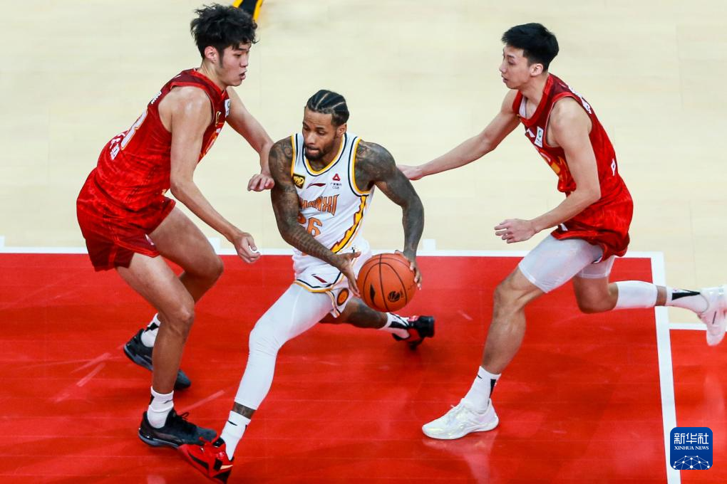12月24日,山西汾酒队球员莱蒙(中)在比赛中带球突破。