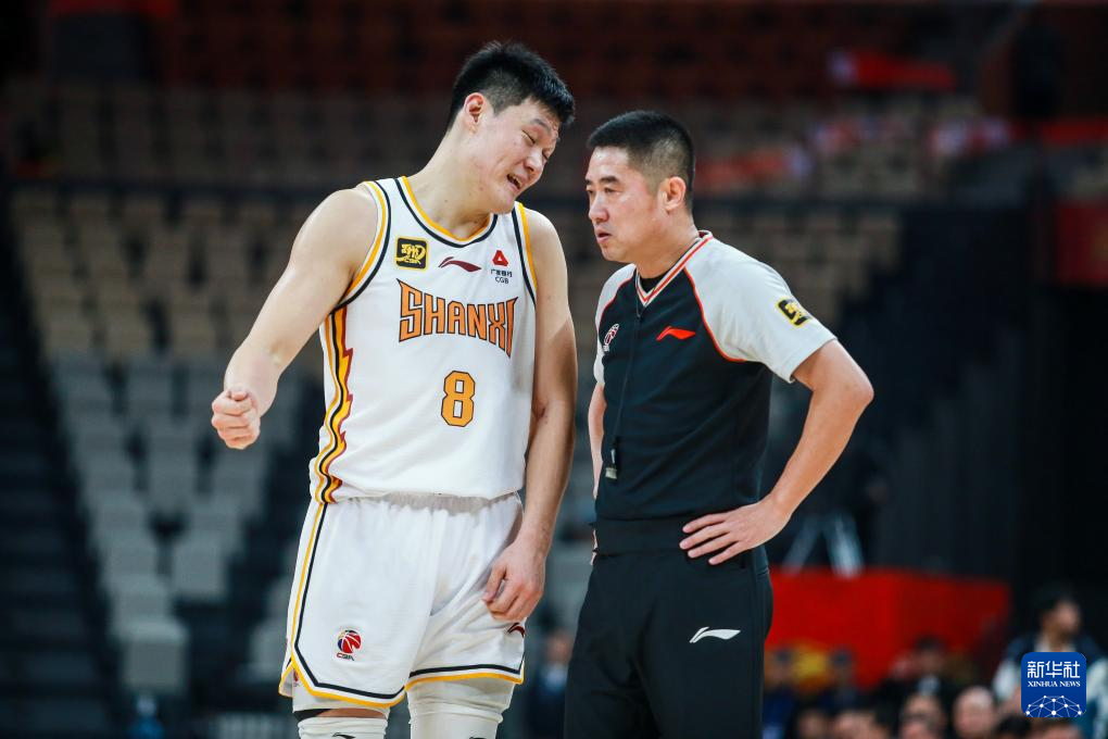 12月24日,山西汾酒队球员张宁(左)在比赛中与裁判交流。