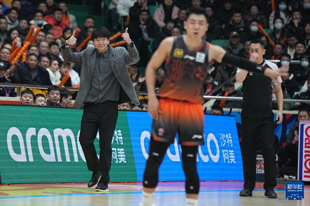 12月23日,山东高速队主教练邱彪(左)在场边示意。