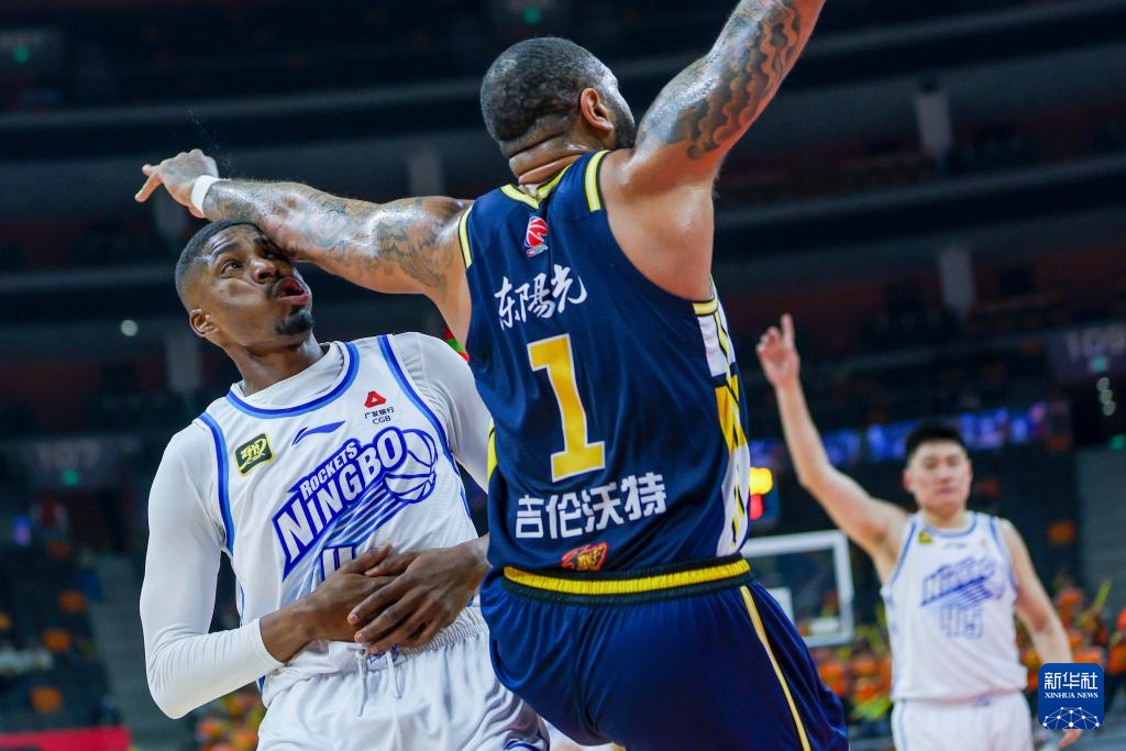 12月23日,广东东阳光队球员吉伦沃特(前右)在比赛中碰到宁波町渥队球员马奇的头部。