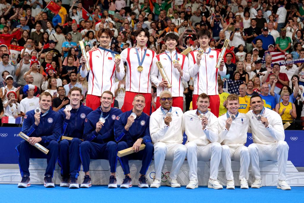 8月4日,冠军中国队(上)、亚军美国队(下左)、季军法国队在巴黎奥运会游泳项目男子4x100米混合泳接力颁奖仪式上。新华社记者 杜宇 摄