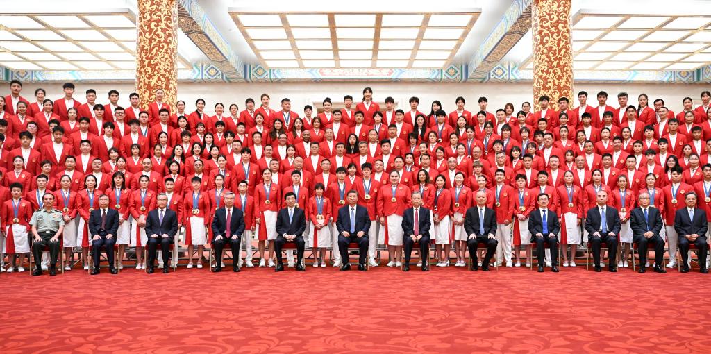 8月20日,党和国家领导人习近平、赵乐际、王沪宁、蔡奇、李希、韩正等在人民大会堂接见第33届夏季奥林匹克运动会中国体育代表团全体成员。新华社记者 谢环驰 摄