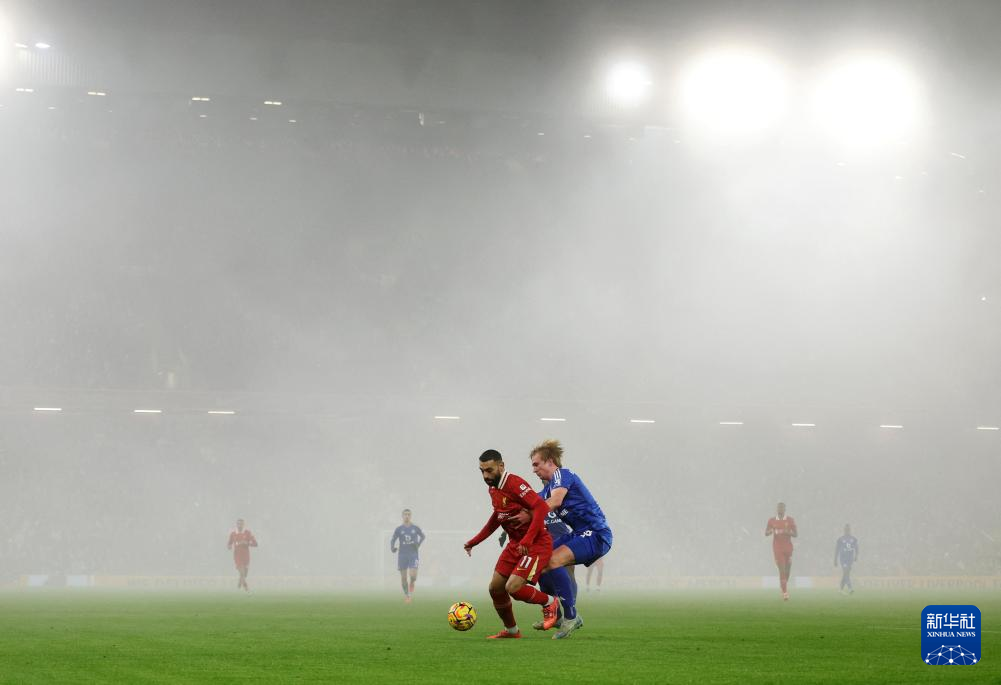 12月26日,利物浦队球员萨拉赫(左)与莱斯特城队球员克里斯蒂安森在比赛中拼抢。