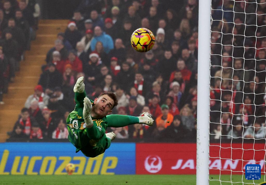 12月26日,利物浦队球员加克波(中)在比赛中射门得分。
