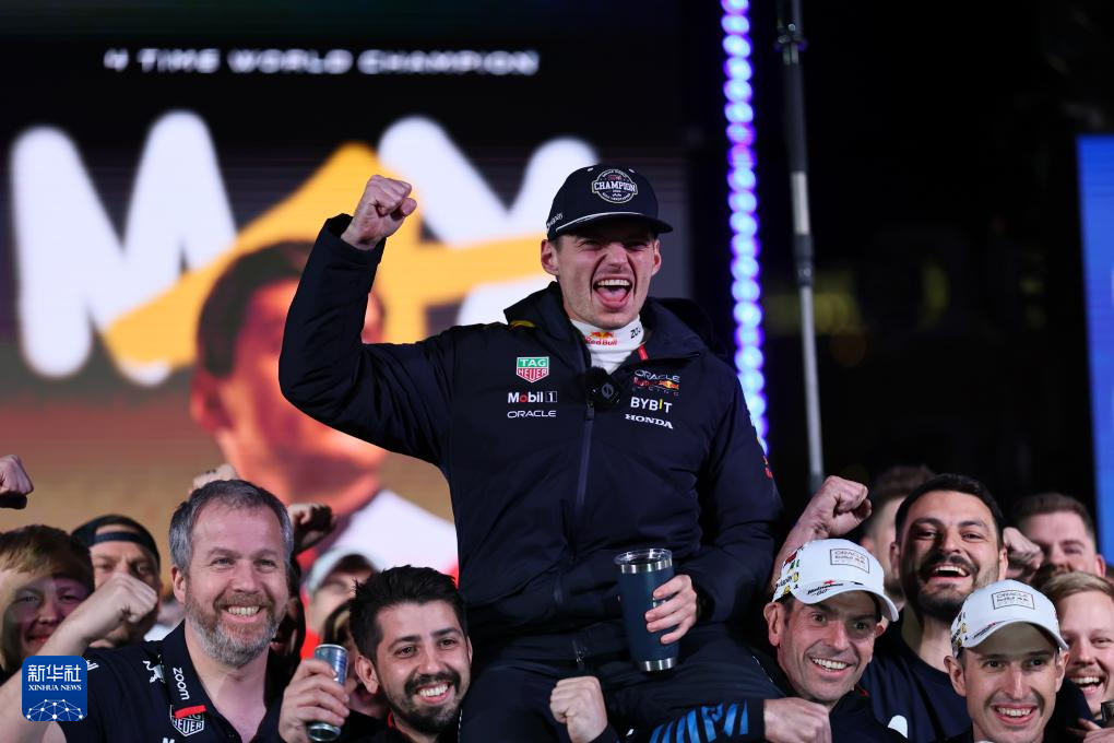 这是2024年11月24日,红牛车队荷兰车手维斯塔潘(上)在2024赛季F1拉斯维加斯大奖赛正赛结束后庆祝自己第四个F1世界冠军。新华社发(宋海源摄)