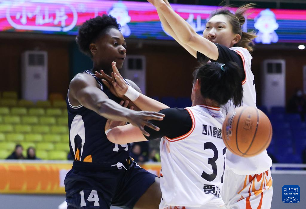 12月27日,石家庄英励队球员巴蒂斯特(右)在四川蜀道远达队球员韩旭(左)、王雪朦的防守下上篮。