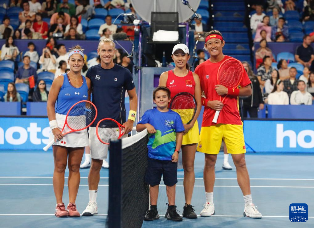 12月27日,中国组合张之臻(右一)/张帅(右二)与巴西组合马托斯(左二)/阿尔维斯在混双比赛前合影。
