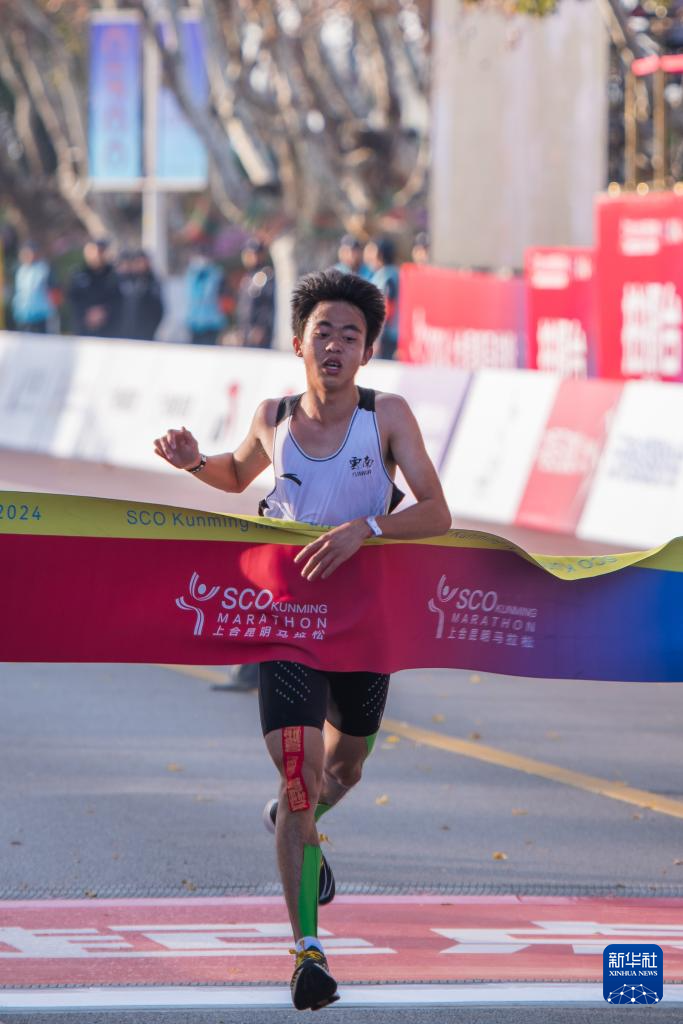 12月29日,埃塞俄比亚选手塞博卡·内古塞·埃雷在比赛中冲过终点线。他以2小时14分51秒的成绩获得男子全程马拉松冠军。新华社记者 胡超 摄