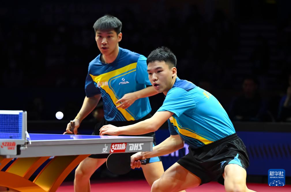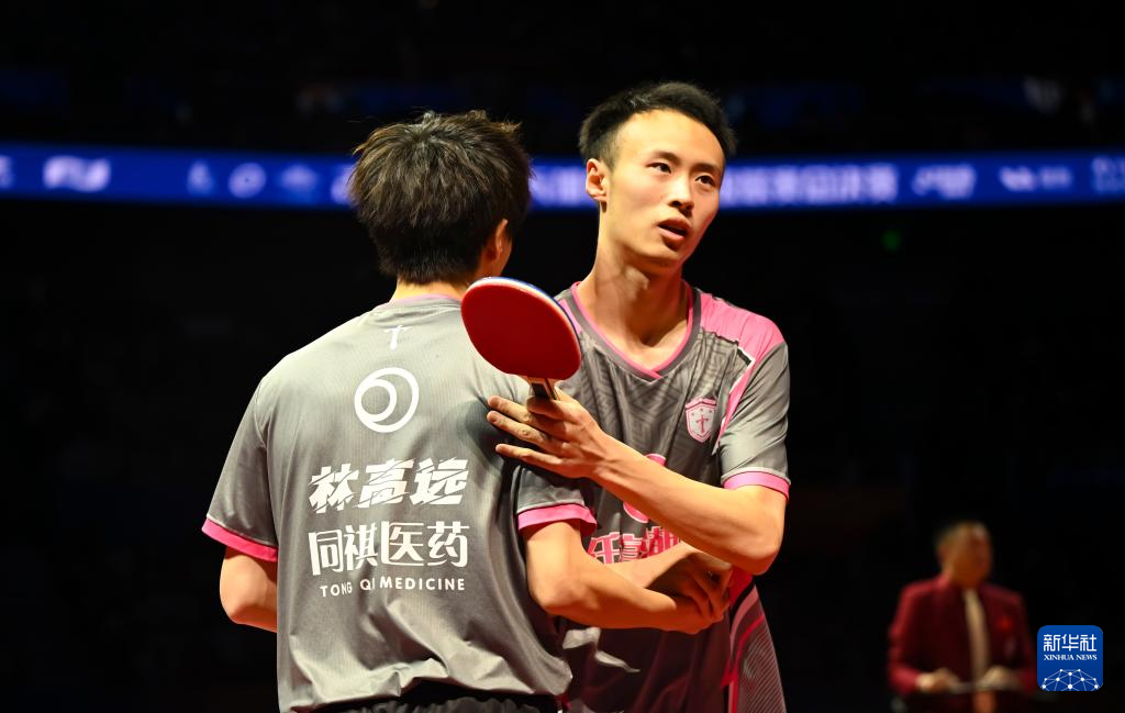 12月31日,汕头明润队组合徐海东/林高远(左)在双打比赛中庆祝得分。他们3比0战胜黄石基地·华新队组合向鹏/薛飞 。
