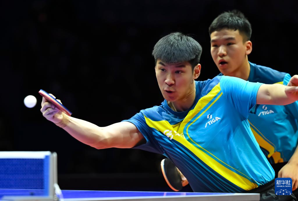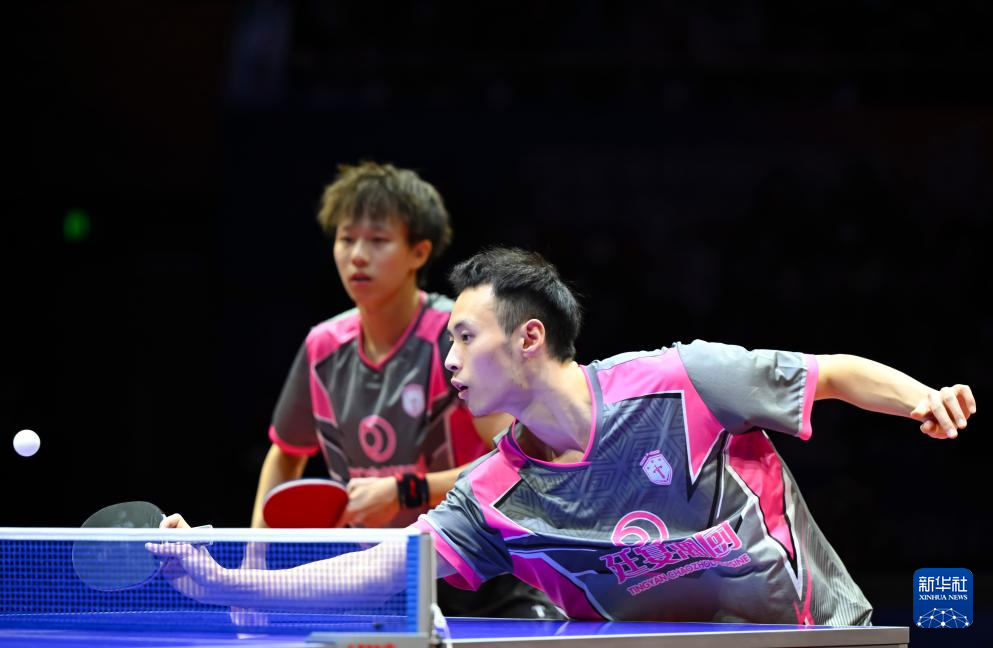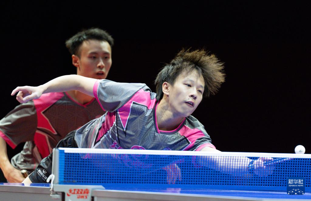 12月31日,汕头明润队组合徐海东(左二)/林高远(左一)在双打比赛中。他们3比0战胜黄石基地·华新队组合向鹏(右一)/薛飞 。