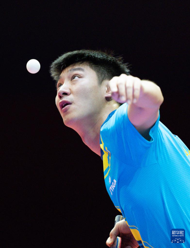 12月31日,汕头明润队选手林高远在单打比赛中发球。他1比3不敌黄石基地·华新队选手薛飞。