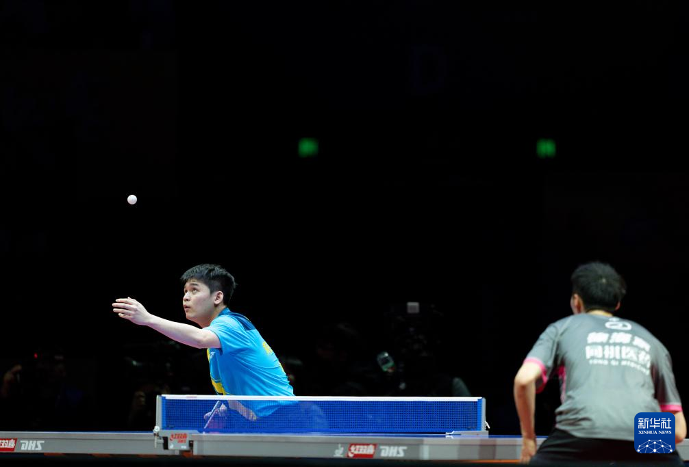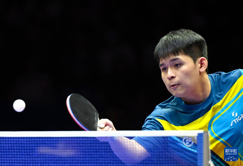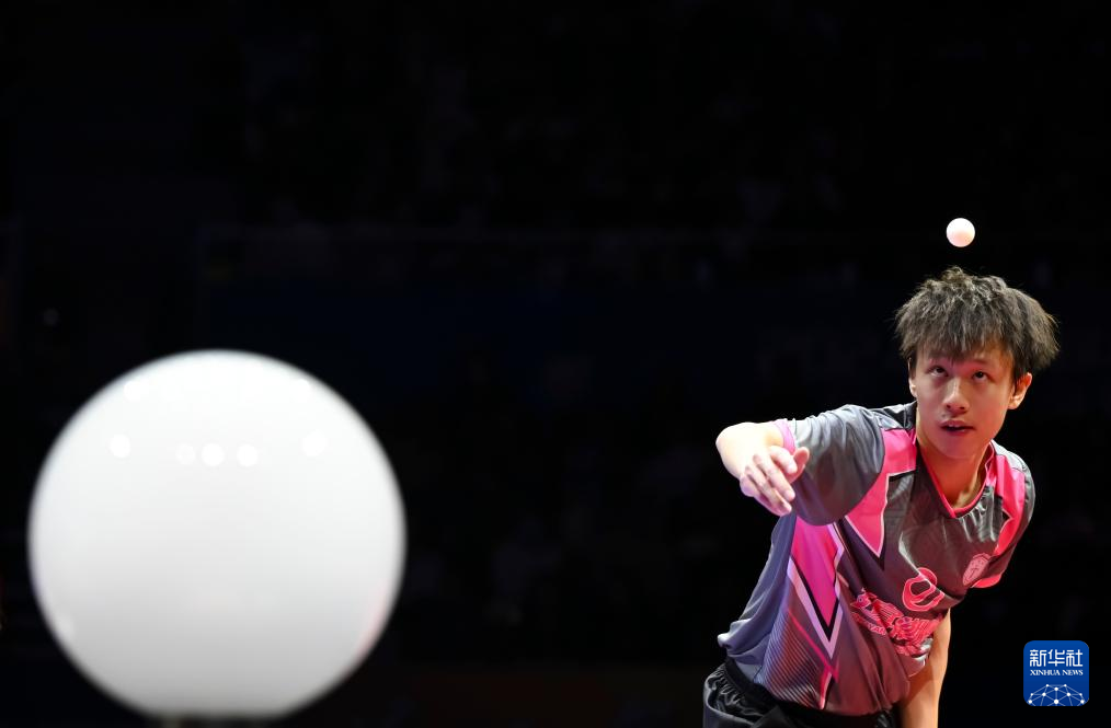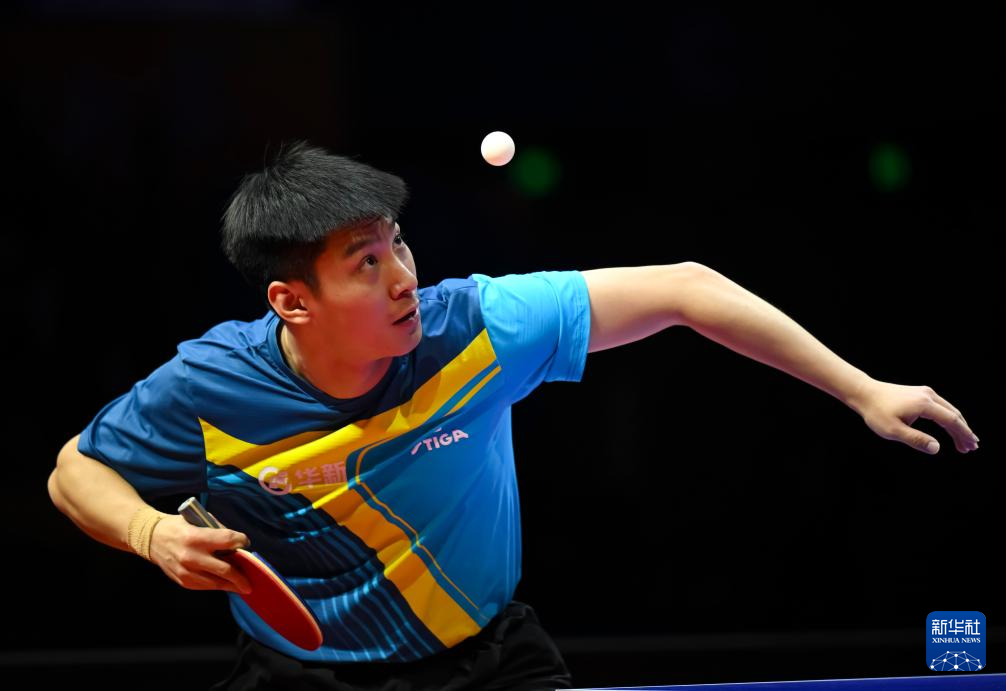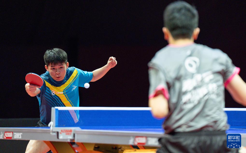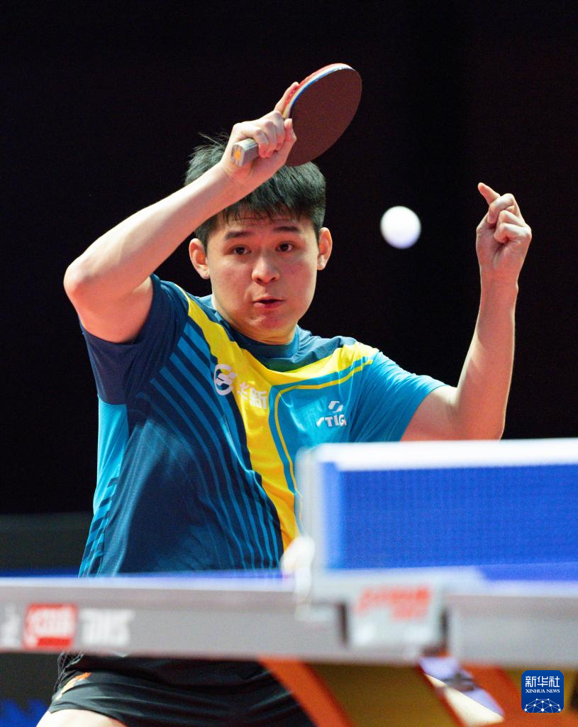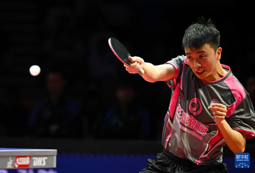 12月31日,黄石基地·华新队选手林诗栋在单打比赛中回球。他3比1战胜汕头明润队选手陈垣宇。