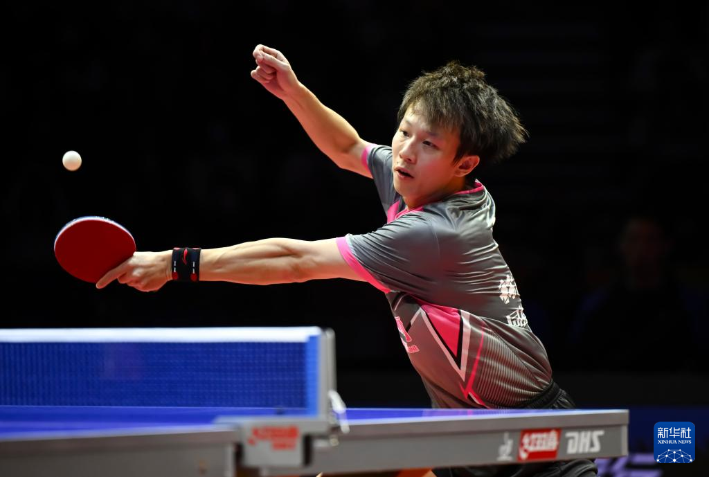 12月31日,黄石基地·华新队选手林诗栋在单打比赛中回球。他3比0战胜汕头明润队选手徐海东。