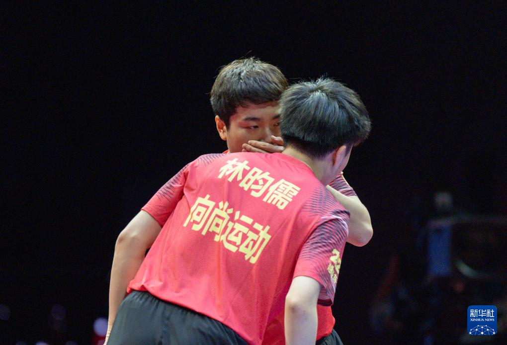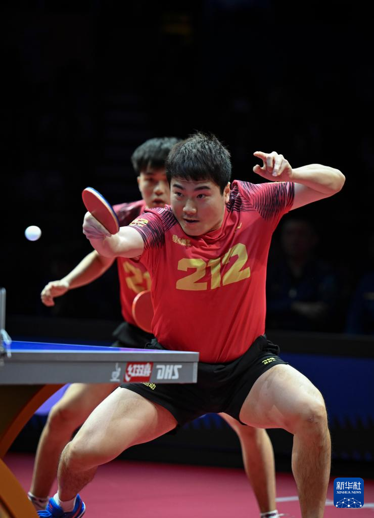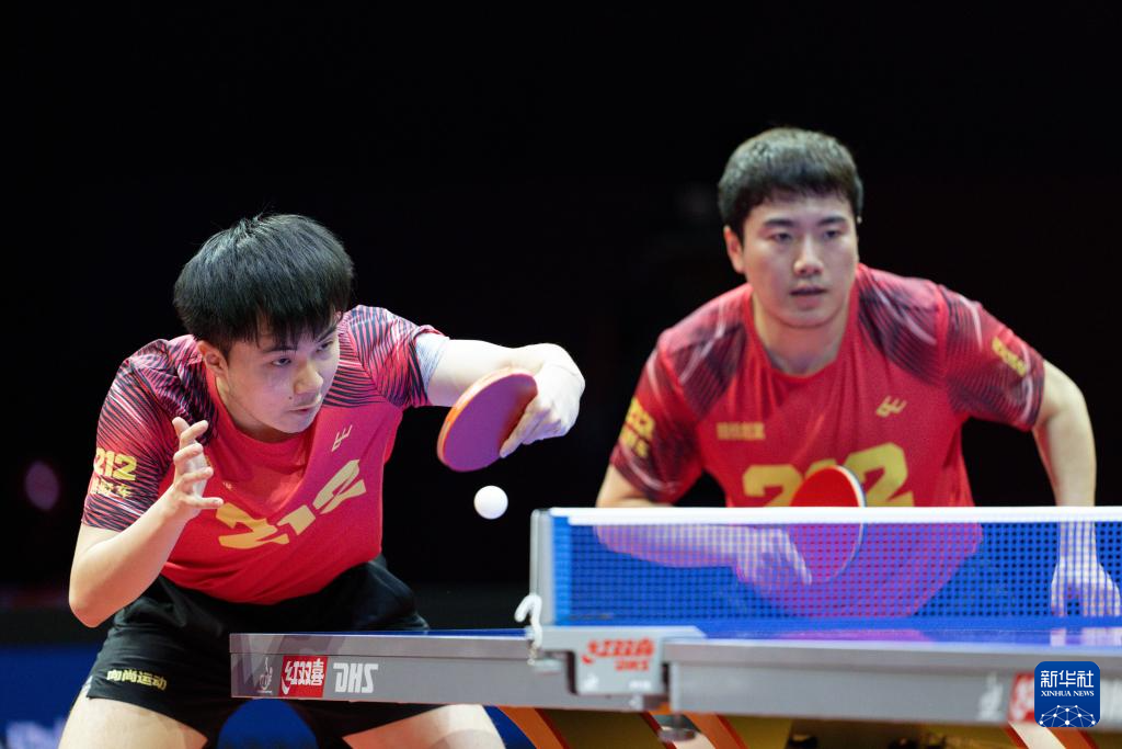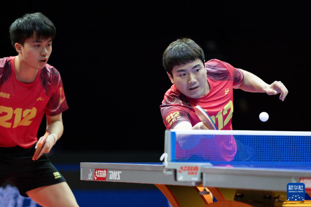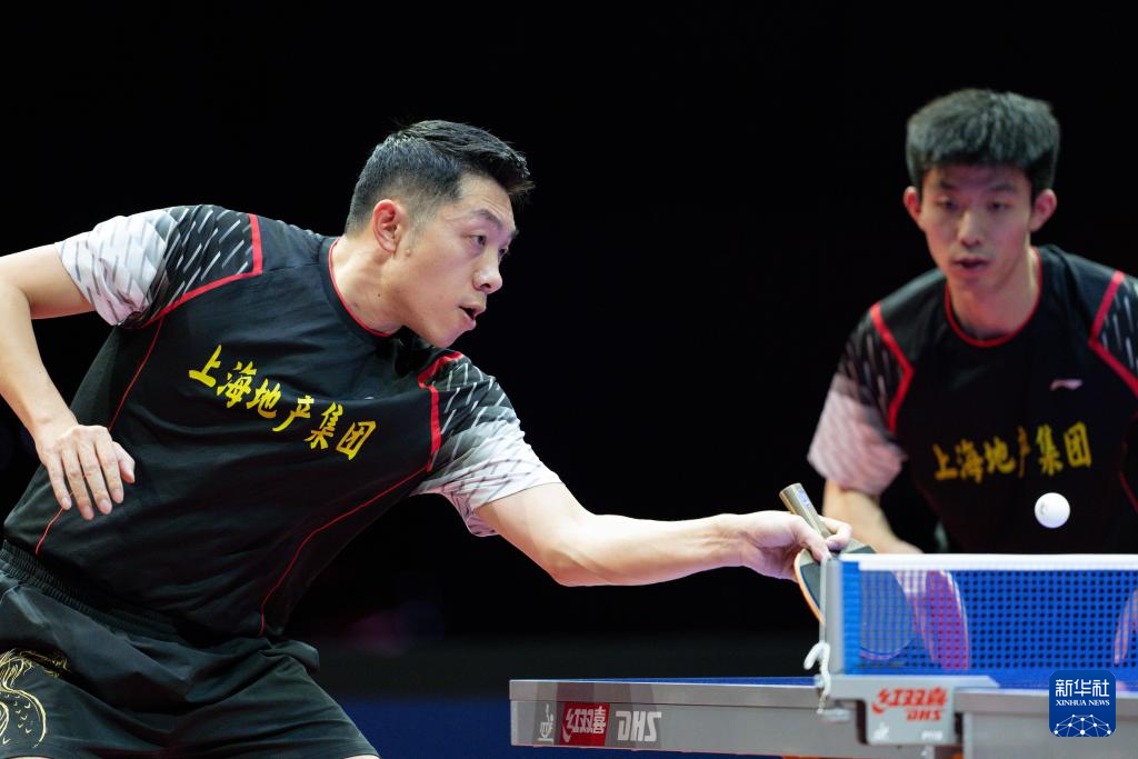 12月31日,山东魏桥·向尚运动队组合林昀儒(左)/梁靖崑在双打比赛中。他们3比1战胜上海地产集团队组合许昕/周恺。