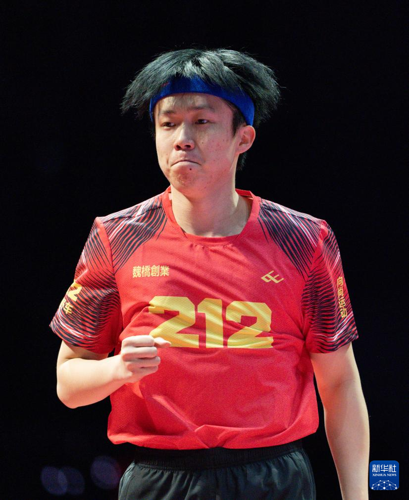 12月31日,山东魏桥·向尚运动队选手王楚钦在单打比赛中庆祝得分。他3比1战胜上海地产集团队选手樊振东。