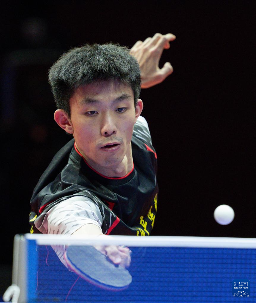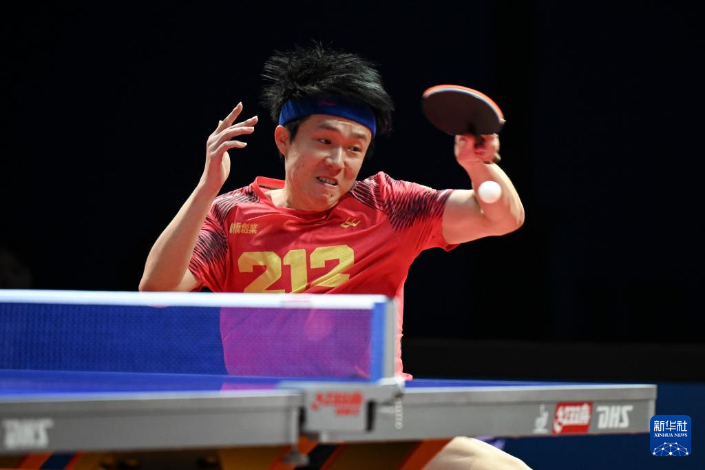 12月31日,山东魏桥·向尚运动队选手王楚钦在单打比赛中回球。他3比1战胜上海地产集团队选手樊振东。