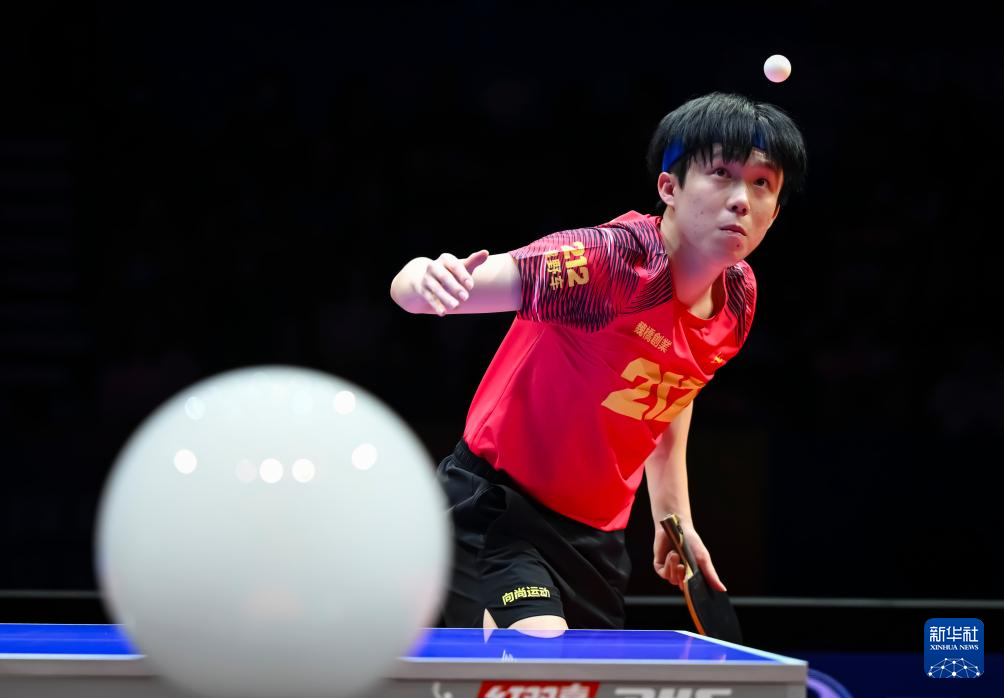 12月31日,山东魏桥·向尚运动队选手王楚钦在单打比赛中发球。他3比1战胜上海地产集团队选手樊振东。
