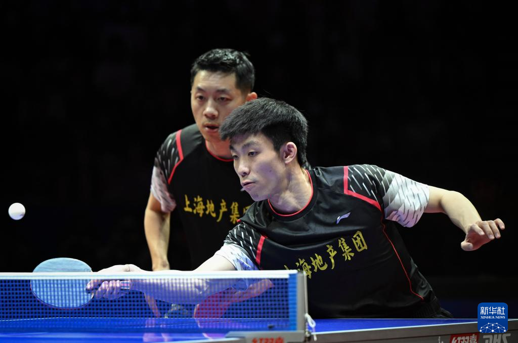 12月31日,上海地产集团队组合许昕(左)/周恺在双打比赛中。他们1比3不敌山东魏桥·向尚运动队组合林昀儒/梁靖崑。