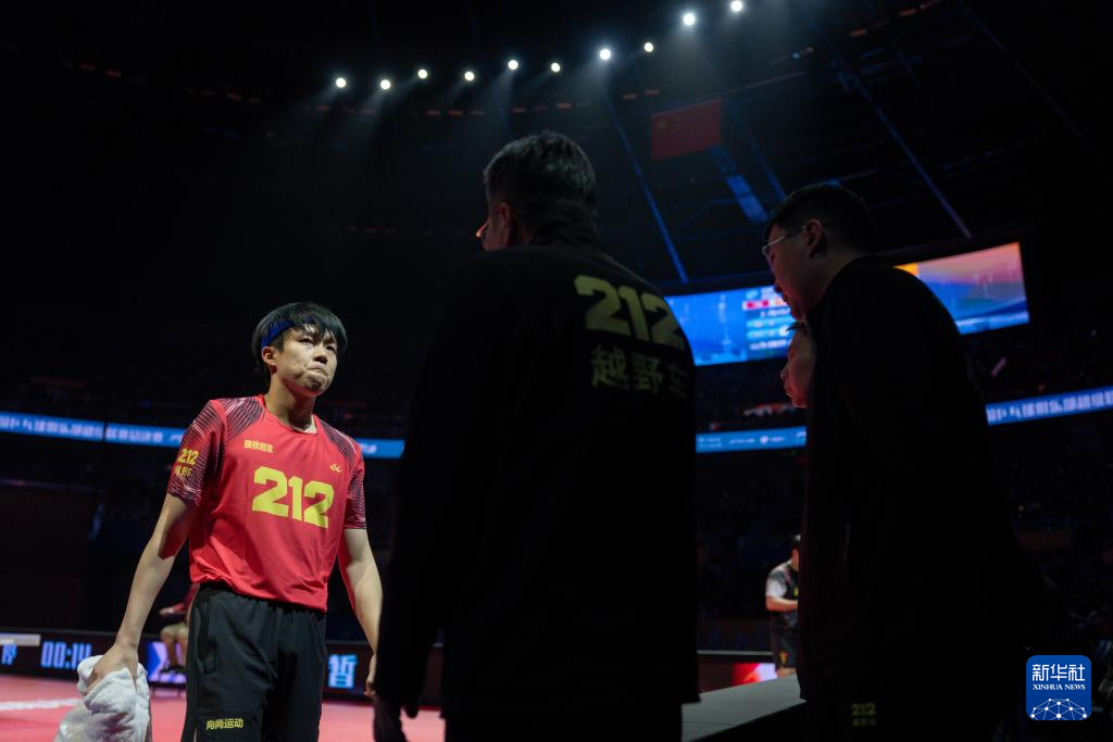 12月31日,山东魏桥·向尚运动队选手王楚钦(左)在单打比赛间隙接受教练员指导。他3比1战胜上海地产集团队选手樊振东。