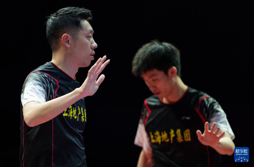 12月31日,山东魏桥·向尚运动队组合林昀儒(前)/梁靖崑在双打比赛中商议战术。他们3比1战胜上海地产集团队组合许昕/周恺。