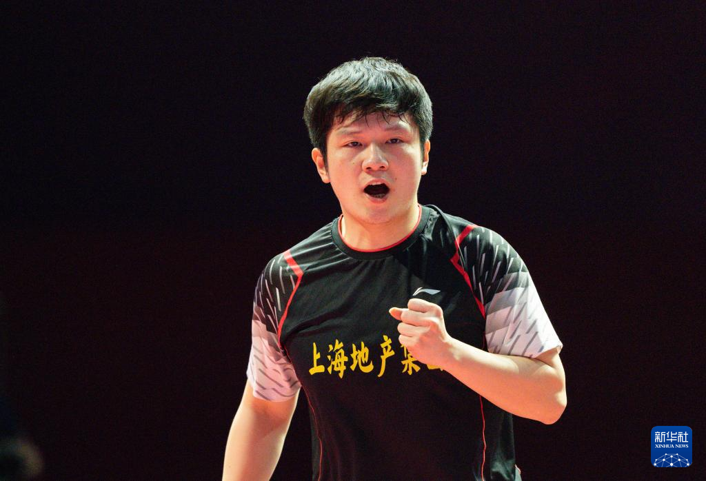 12月31日,上海地产集团队选手樊振东在单打比赛中庆祝得分。他1比3不敌山东魏桥·向尚运动队选手王楚钦。