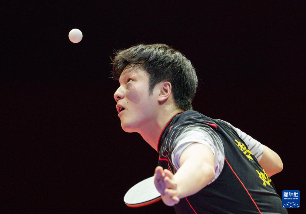 12月31日,上海地产集团队选手樊振东在单打比赛中发球。他1比3不敌山东魏桥·向尚运动队选手王楚钦。