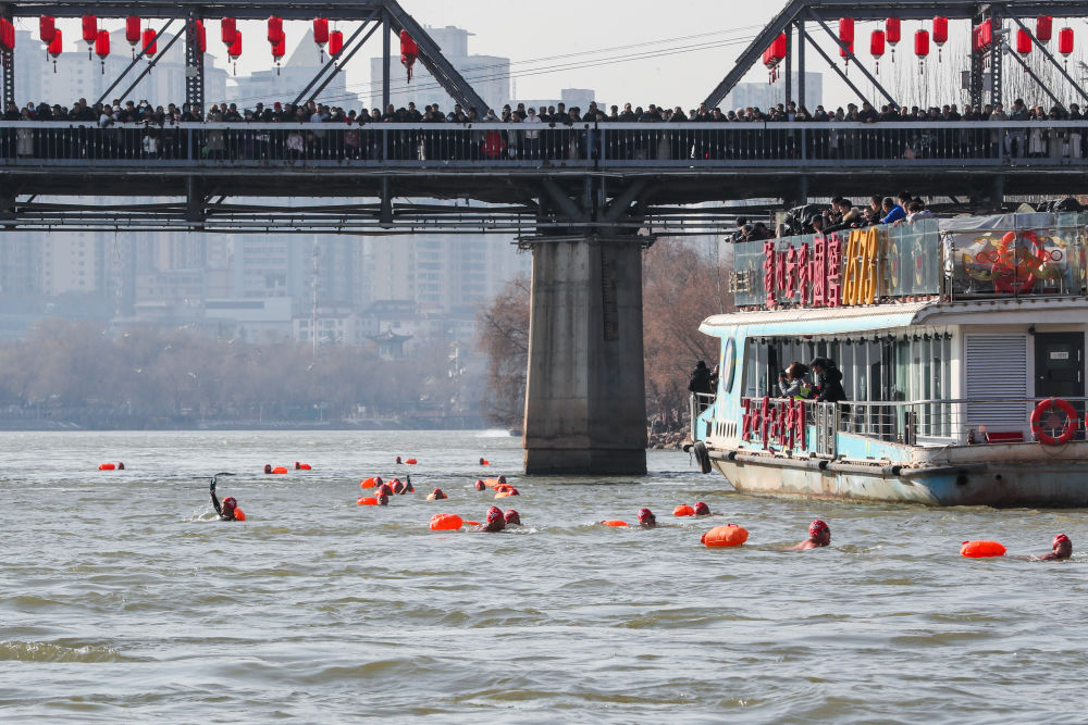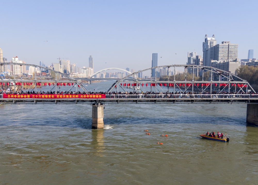 新华社兰州1月1日电(记者张睿)1日下午,在甘肃省兰州市城关区中山桥附近的黄河岸边,伴随一声令下,200余名装备齐整的冬泳爱好者,有说有笑地扑进黄河,大河之上一片欢腾。