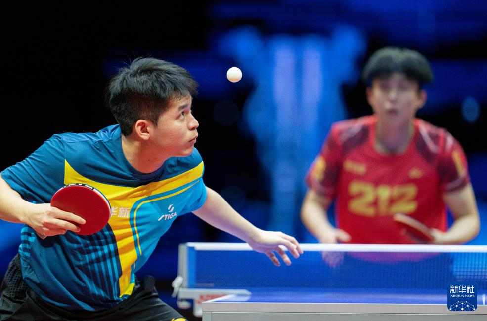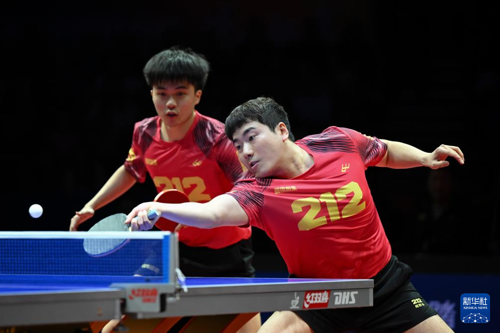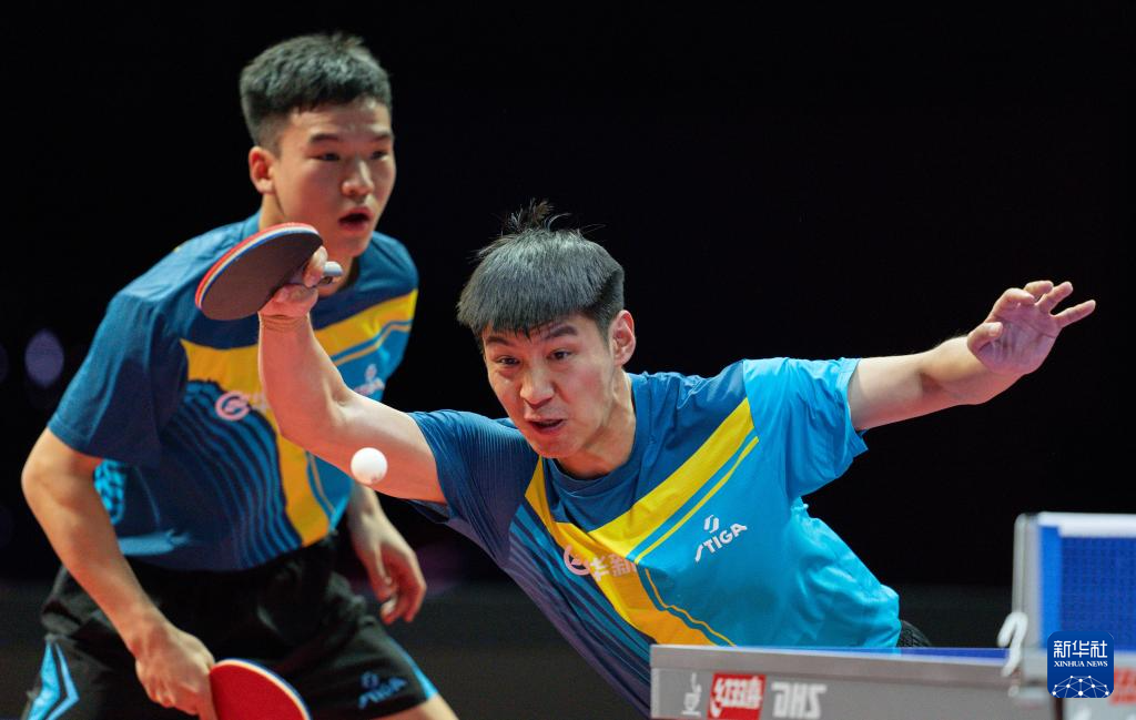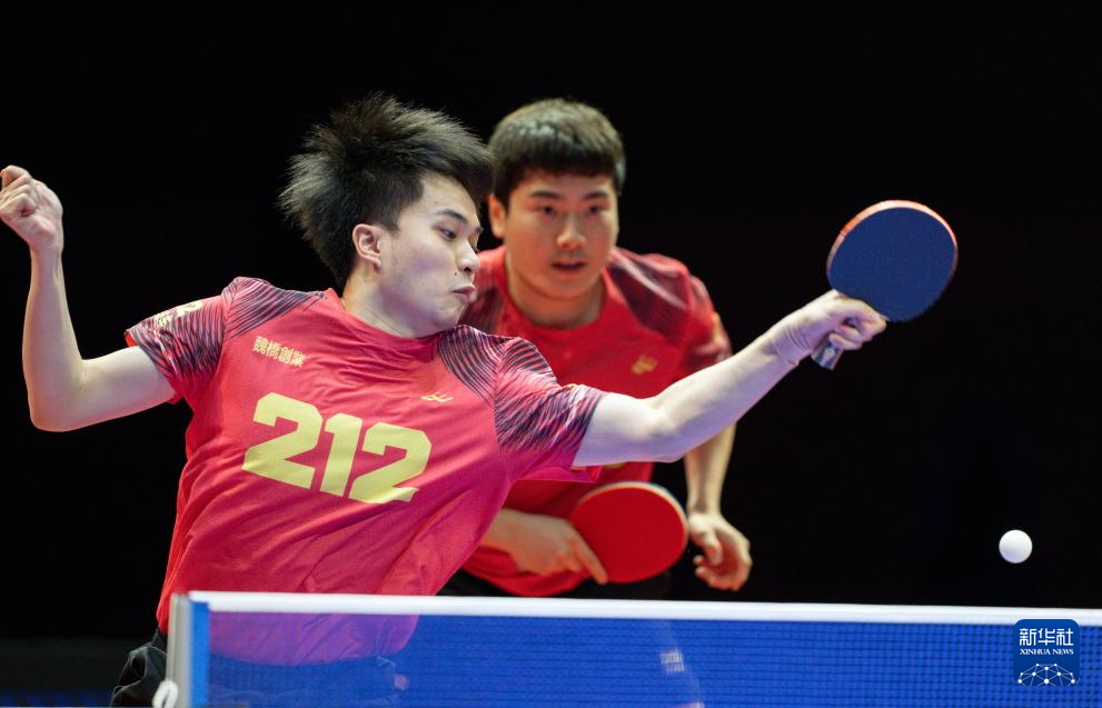 1月1日,山东魏桥·向尚运动队组合林昀儒/梁靖崑(右)在双打比赛中。他们3比2战胜黄石基地·华新队组合向鹏/薛飞。