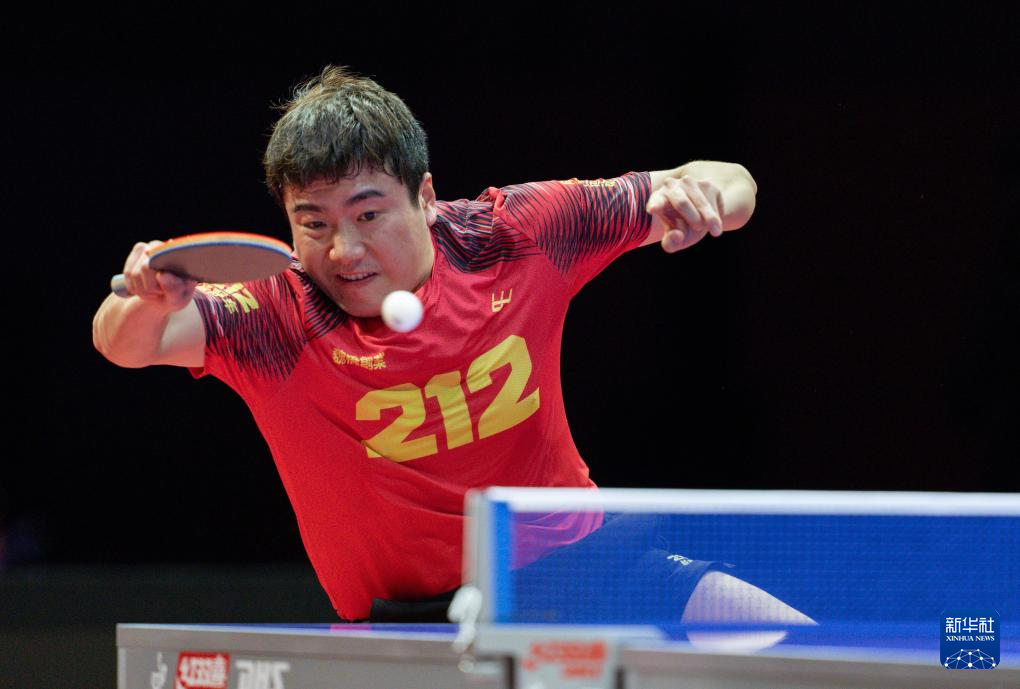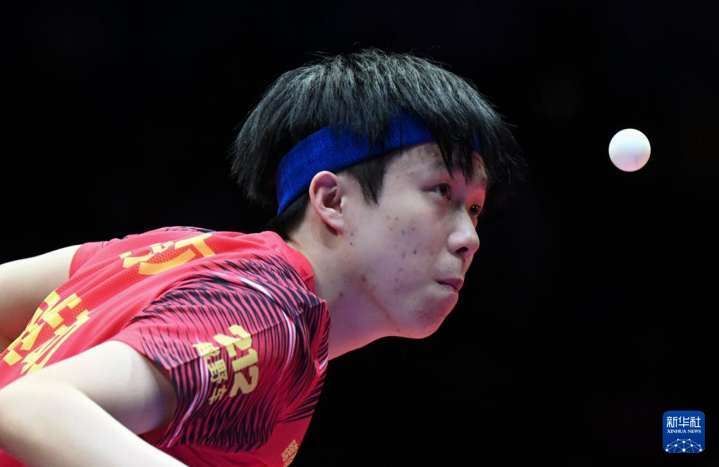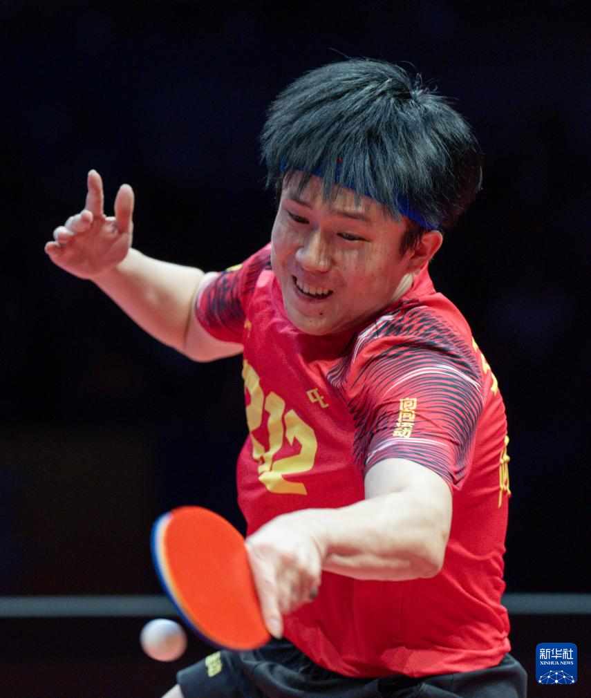 1月1日,山东魏桥·向尚运动队选手王楚钦在单打比赛中回球。他3比2战胜黄石基地·华新队选手林诗栋。
