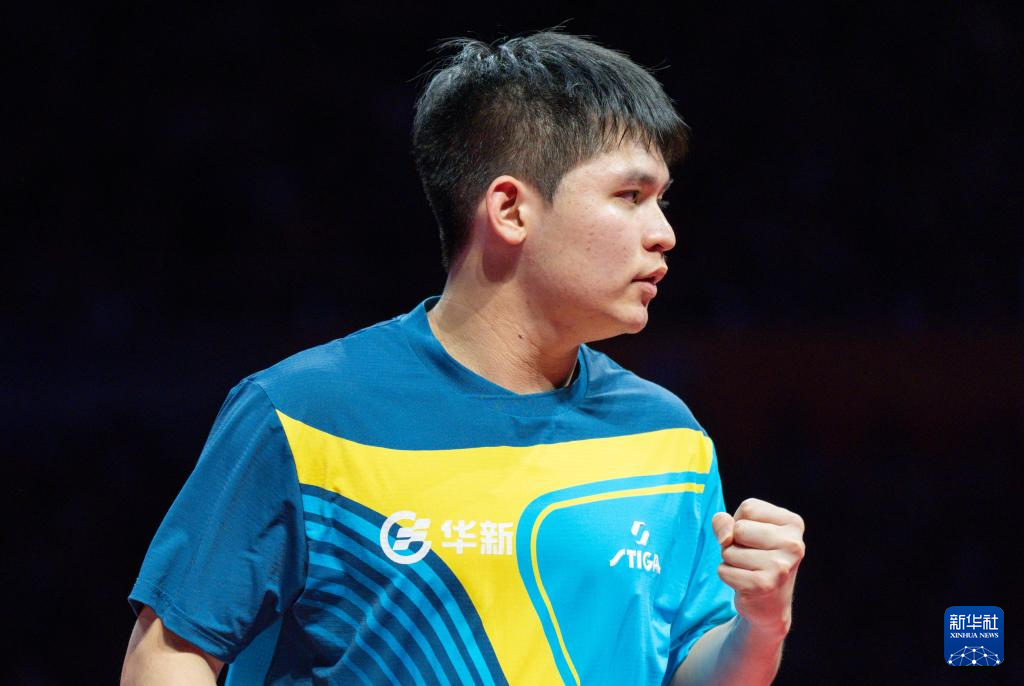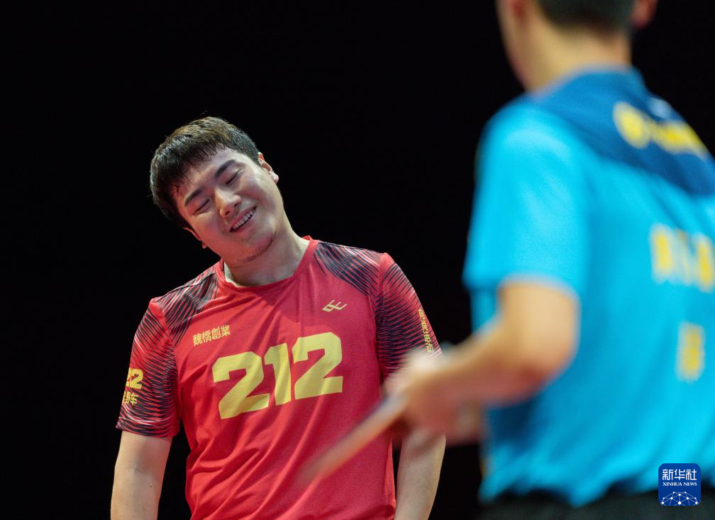 1月1日,山东魏桥·向尚运动队选手王楚钦在单打比赛后庆祝胜利。他3比2战胜黄石基地·华新队选手林诗栋。